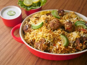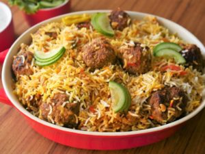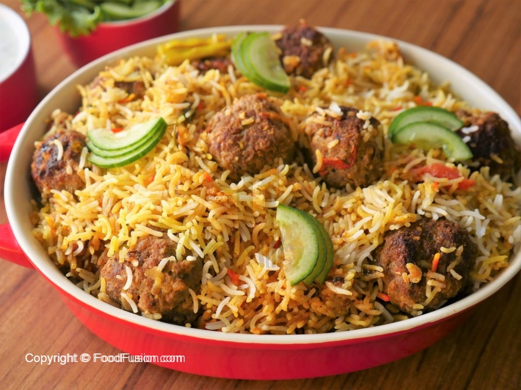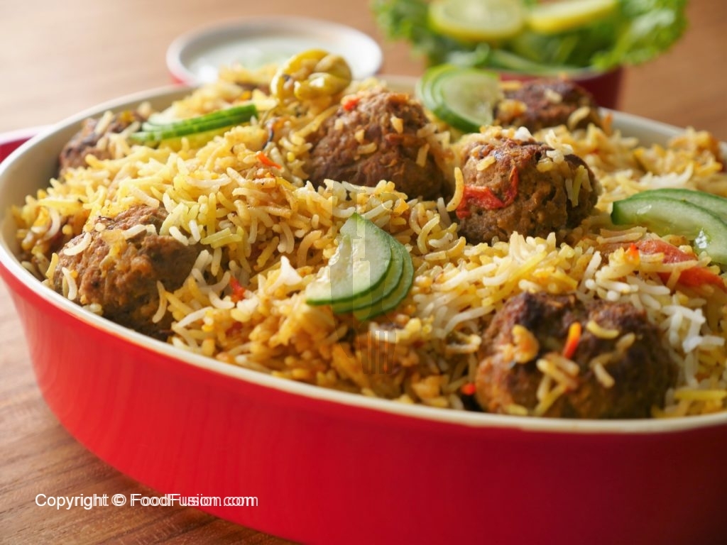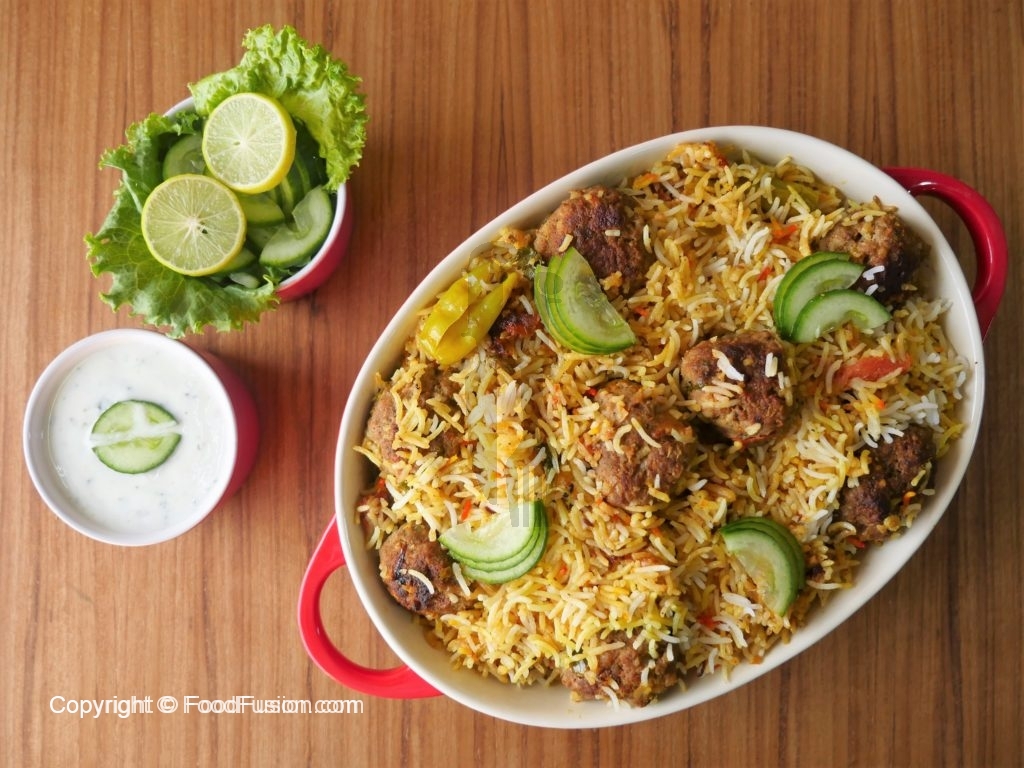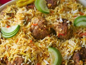 Fried meat balls/koftay,podina,hara dhania,hari mirch,boiled chawal,lemon juice,podina,hara dhania, aloo,hari mirch aur zarda ka rang dal dein,dhak ker 15-20 minute kliya halki ancch per paka lein.