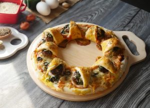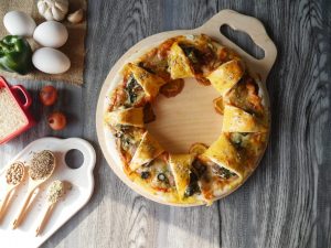 Sprinkle dry flour,cut dough from the center,add & spread pizza sauce,place capsicum and onion rings, fried meatballs (kofty),green chutney,cheddar cheese,mozzarella cheese,black olives and turn all the cuts.