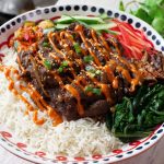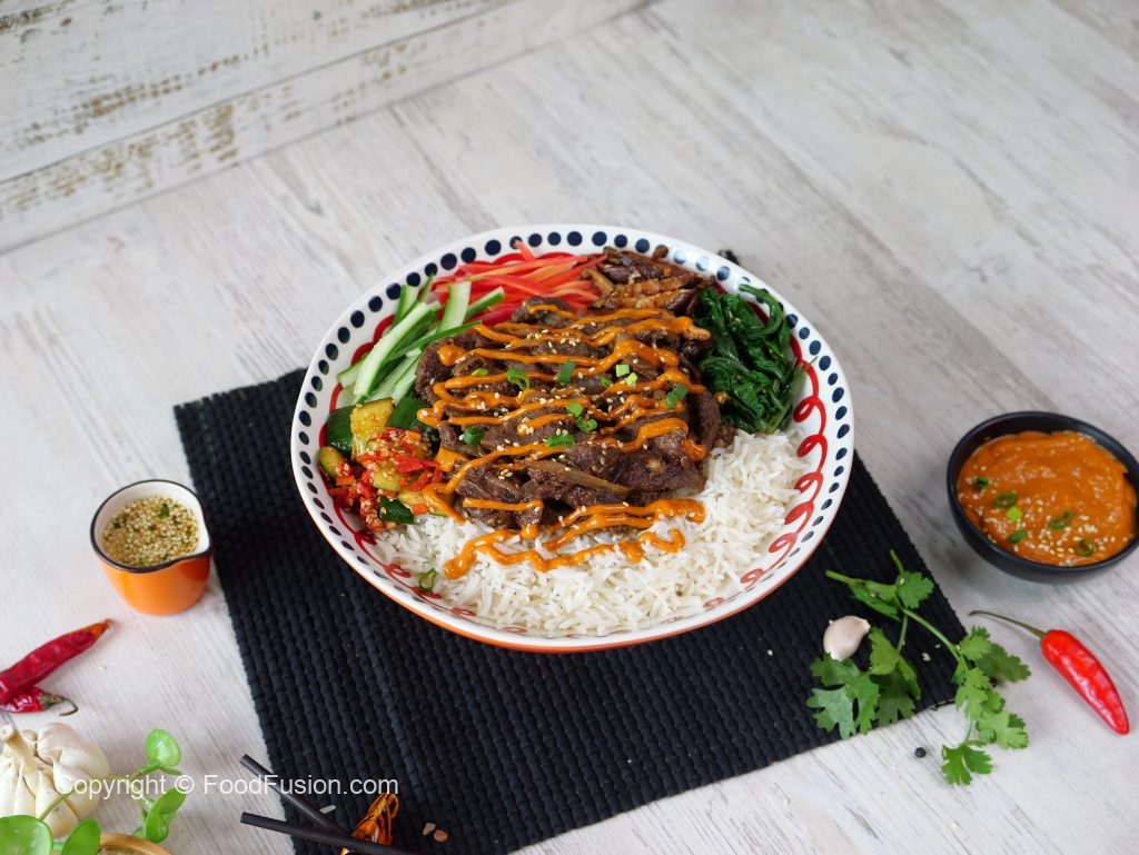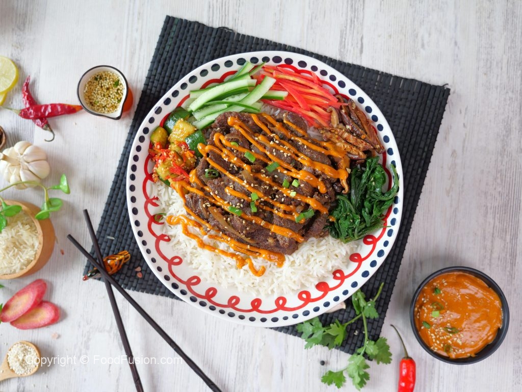 -Ek serving bowl mein cooked rice dalen, upar se beef bulgogi, steamed spinach, stir fried shiitake mushrooms, carrots, cucumber aur kimchi rakhen.