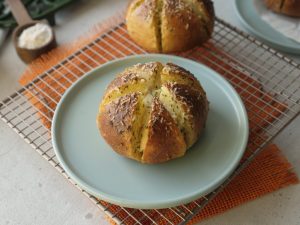 When the bread is cool enough to handle,cut each bread into 6 equal wedges (make sure to not completely cut through the bread and stay intact).