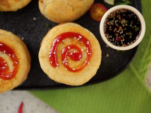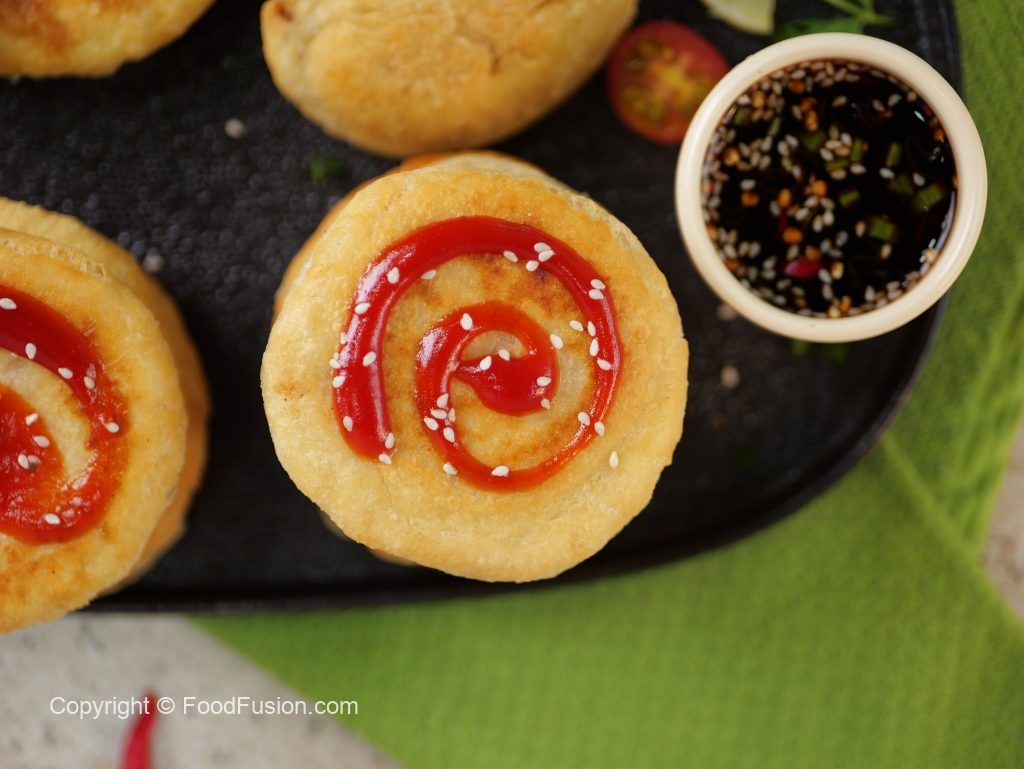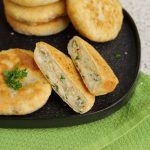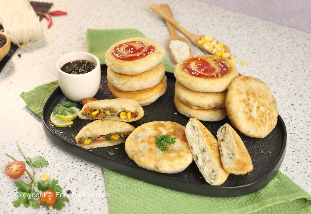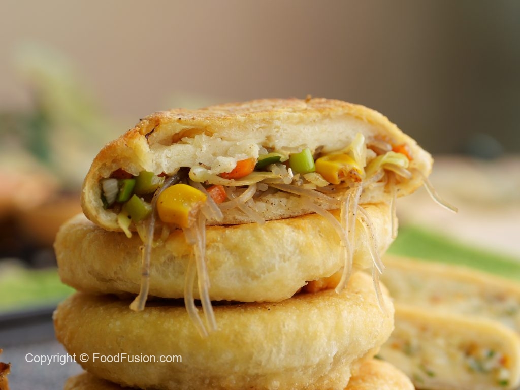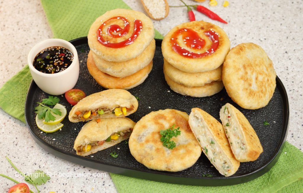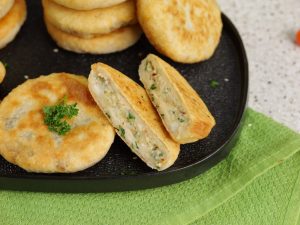-Frying pan mein cooking oil garam karein aur stuffed dough balls rakh ker halki ancch per light golden ho janay tak fry ker lein (1-2 minutes) phir patty presser sa press ker ka halki anchc per dono sides sa golden & crispy ho janay tak fry ker lein (makes 12).