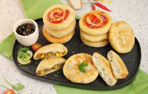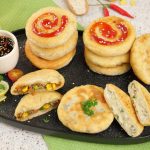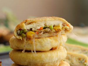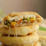 -Veg filling or cheese filling ko dough ka center mein dal dein aur tamam sides ko gather ker ka pinch & seal ker lein.