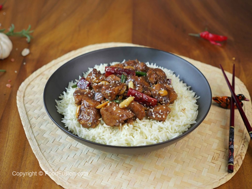 -In a serving bowl, add steamed rice, prepared kung pao chicken, garnish with sesame seeds & serve!
