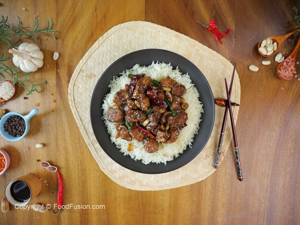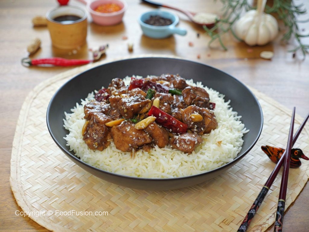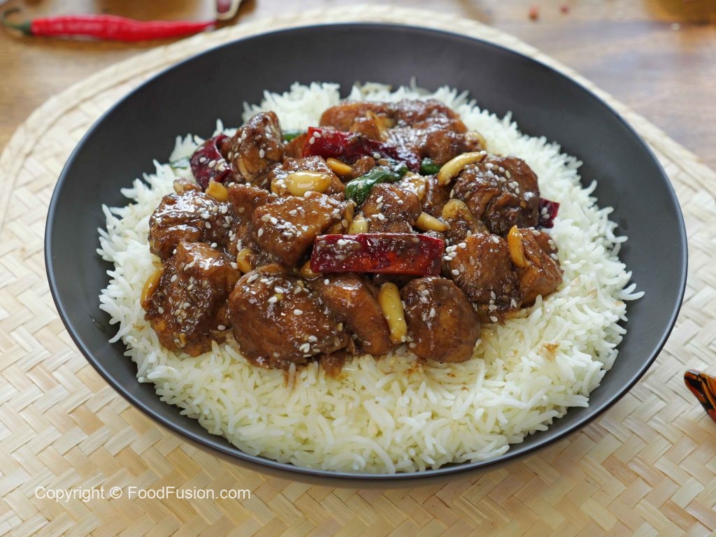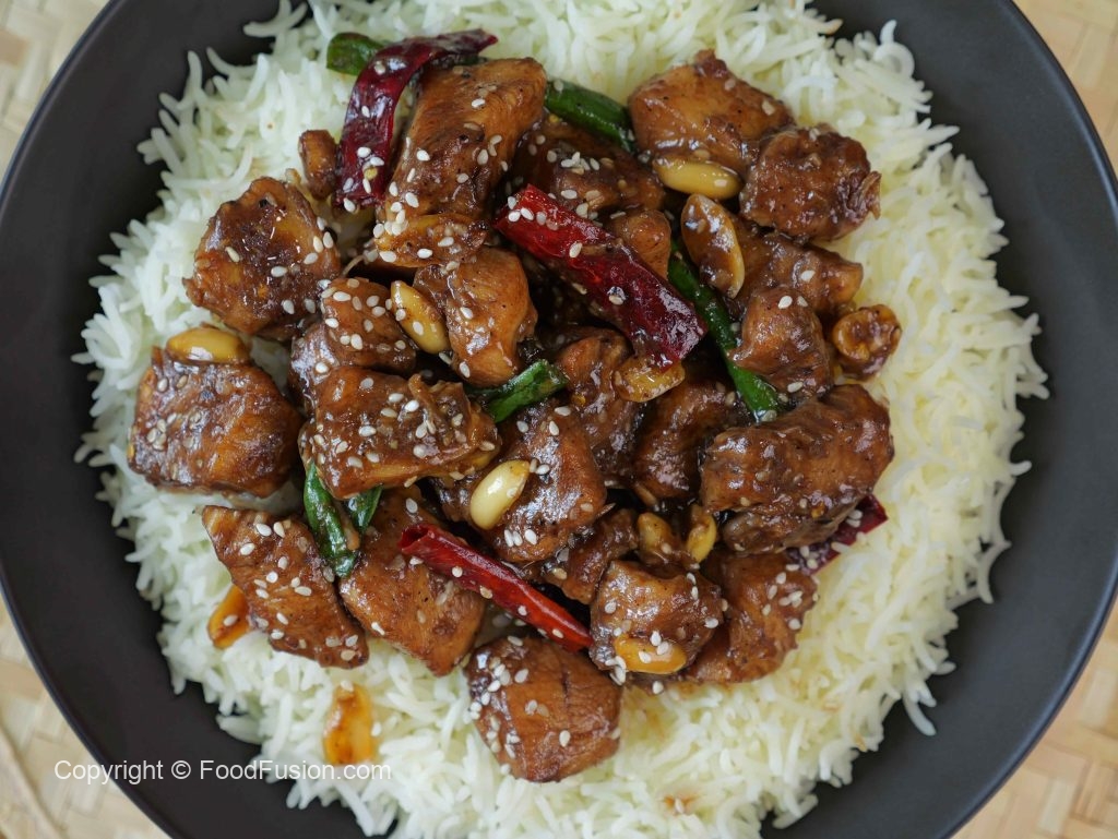 -Ek serving bowl mein steamed rice dalein, prepared Kung Pao Chicken upar se garnish karein with sesame seeds aur serve karein!