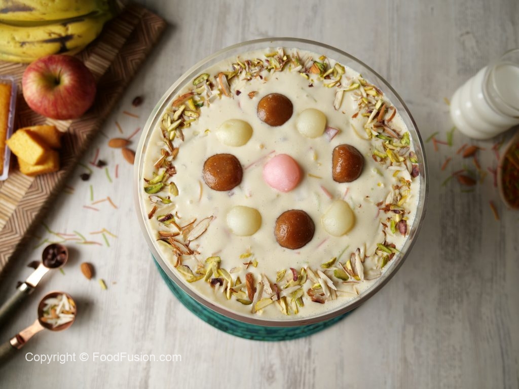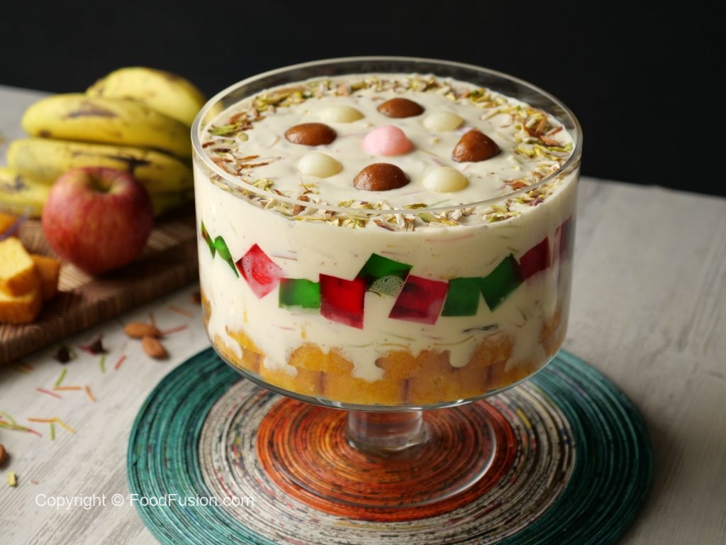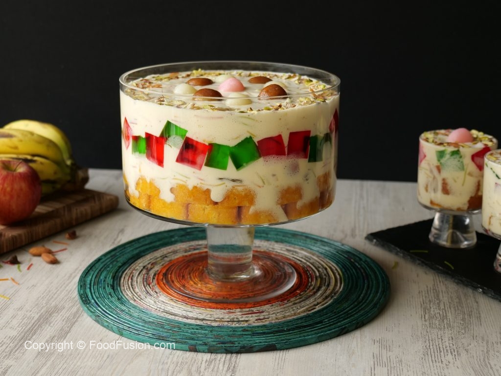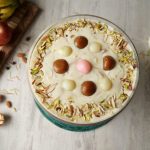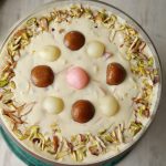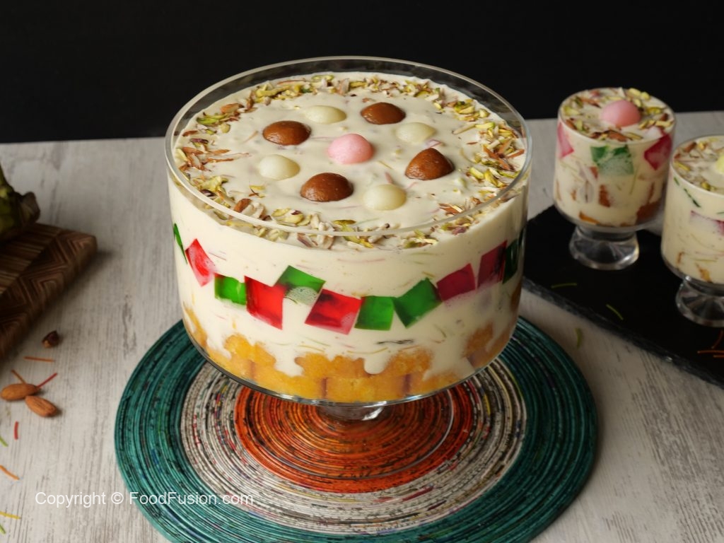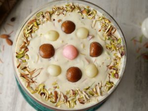 Add prepared lab-e-Shireen,red & green jelly,prepared lab-e-Shireen & garnish with almonds & pistachios,cham cham & serve chilled!