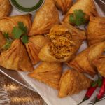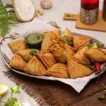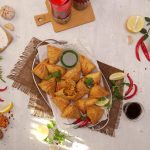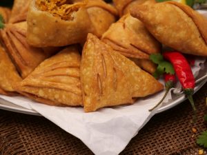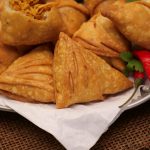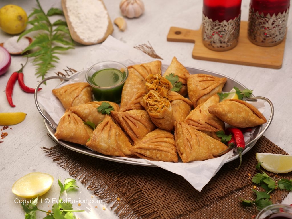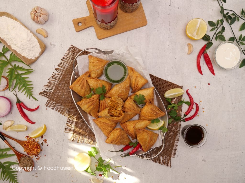 Place prepared chicken filling (1 tbs) at one side of triangle,join two corners & press gently to seal the joint & flip the cut side to make a samosa,press & seal the edges.