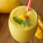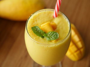 In blender,add mango,yogurt,milk,sugar and blend well.