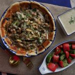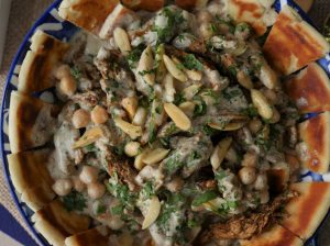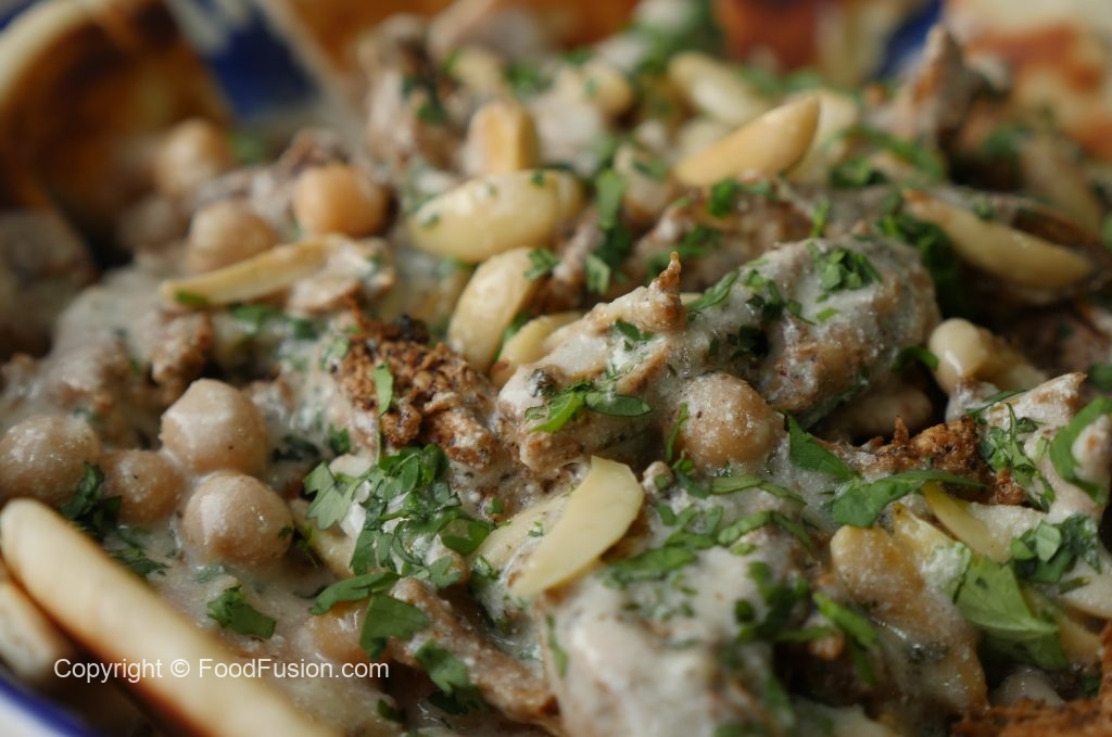 In serving bowl,add chickpeas,pita bread,cooked & shredded chicken,fried almonds and drizzle prepared yogurt sauce and garnish with fresh parsley & serve!