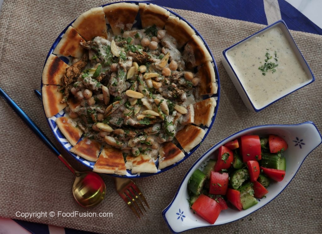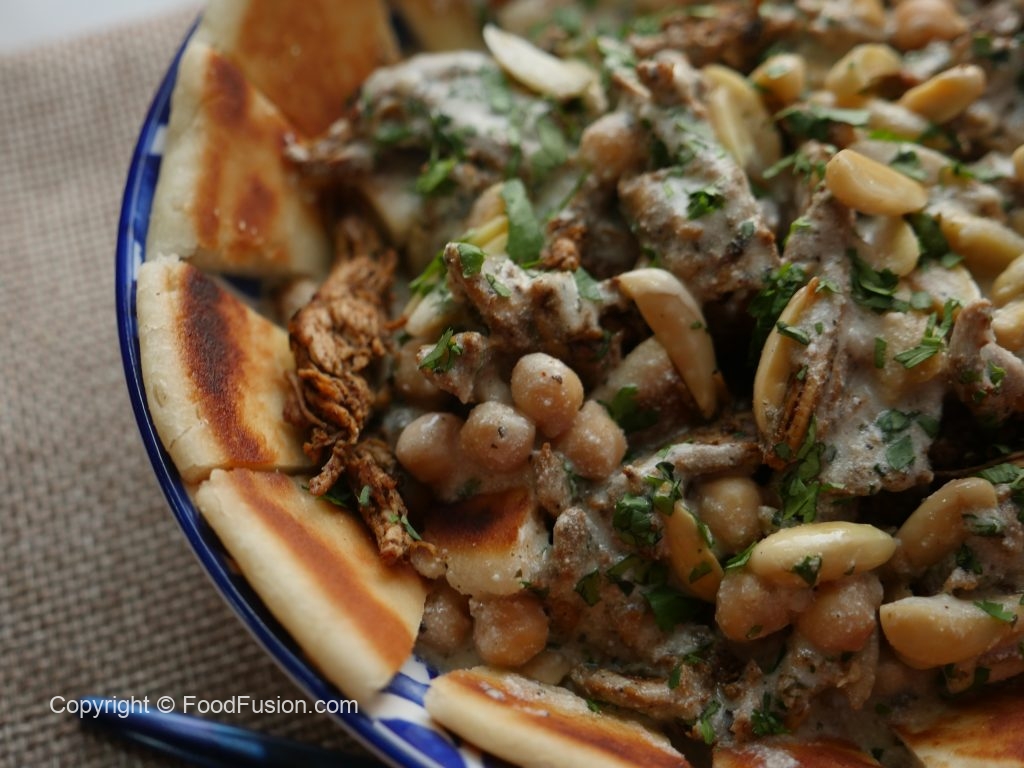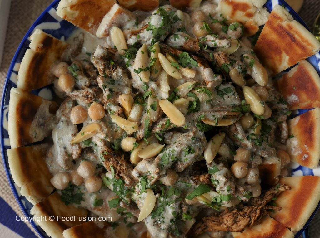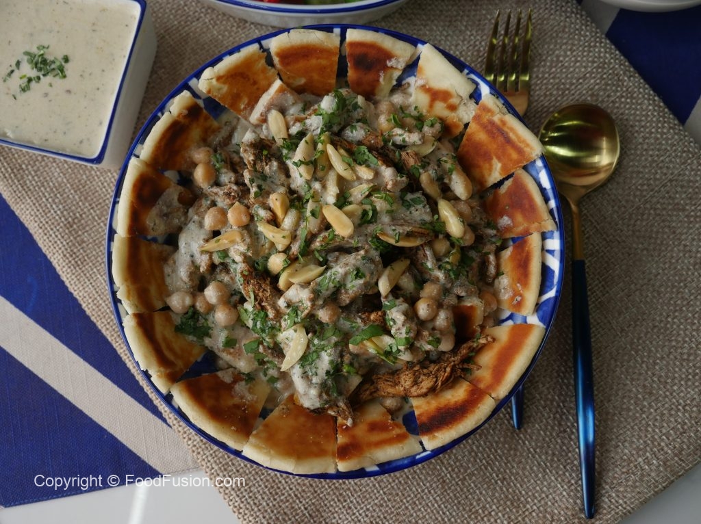 Serving bowl mein chanay,pita bread,cooked & shredded chicken,fried badam,yayyar yogurt sauce aur fresh parsley dal ker serve karein!