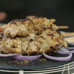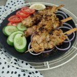 Thread marinated chicken into wooden skewers (makes 9-10).