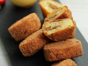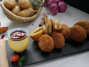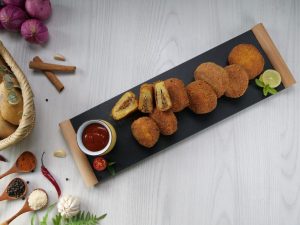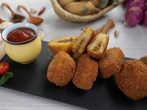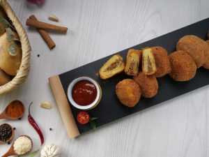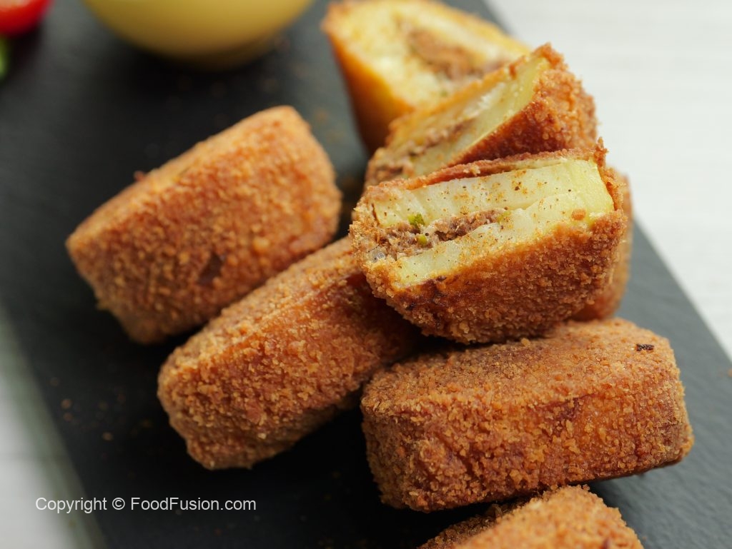 -Dip stuffed potato in whisked eggs & coat with breadcrumbs then again dip in whisked eggs & coat with breadcrumbs.