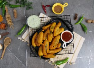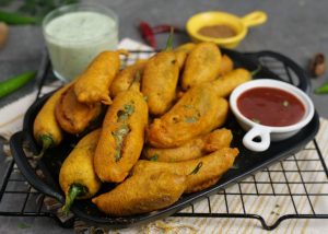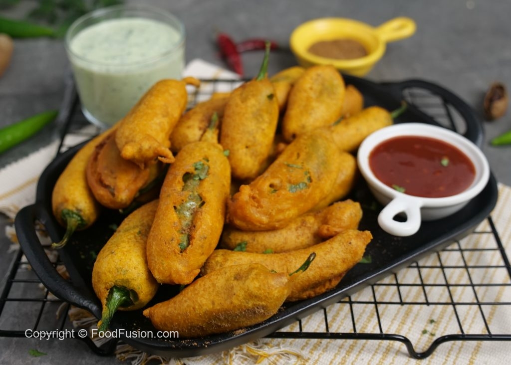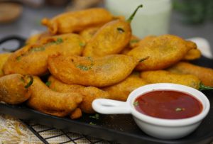 -Aik jug may tayar pakora mix daal kar stuffed hari mirch ko us may dip karen.