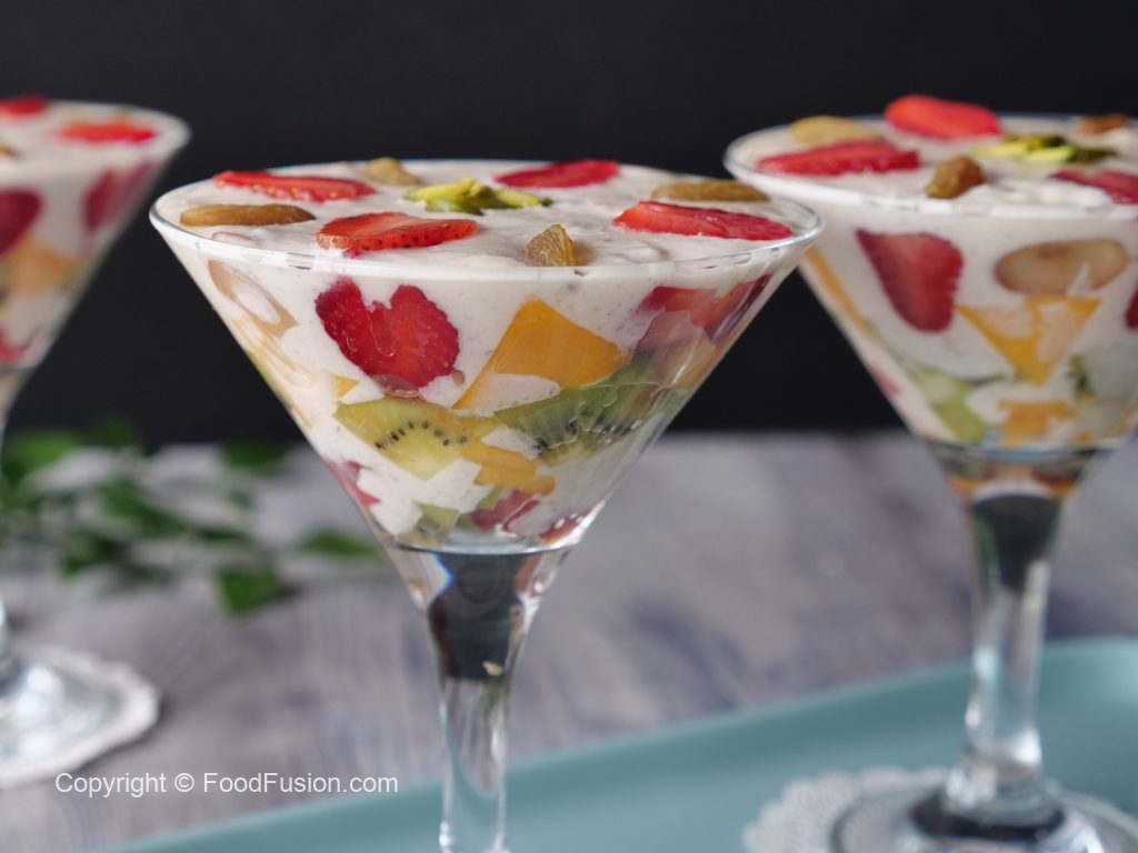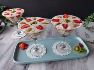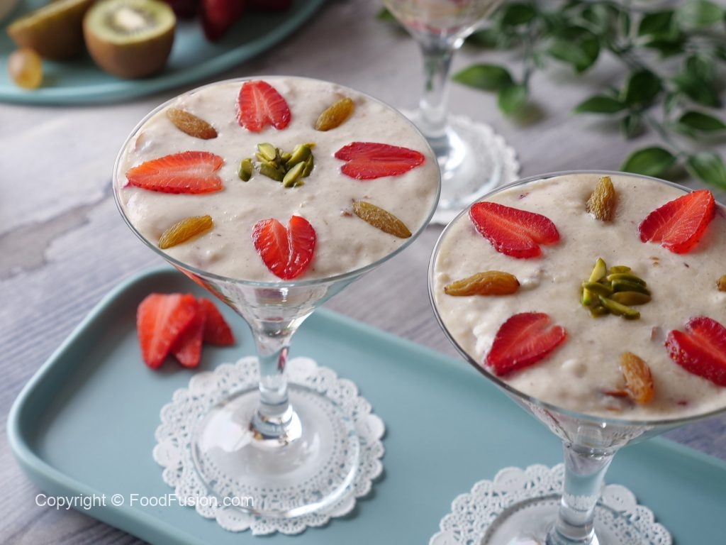 -Serving glass mein mixed fruits,kiwi,papaya,strawberry,grapes aur tayyar firni dal dein.