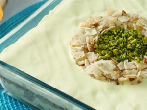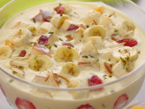 -Strawberry,kishmish aur pista sa garnish ker lein
