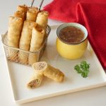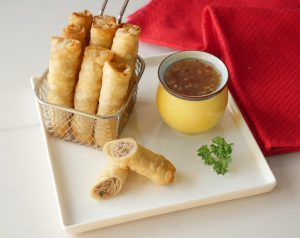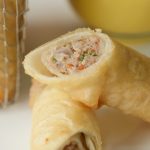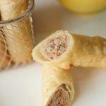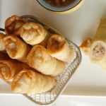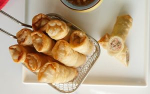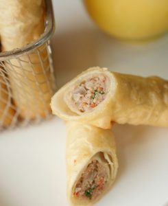 -Take samosa sheet/manda patti 5 x 5”,add mince filling,fold over the sides,roll up and apply all-purpose flour paste.