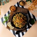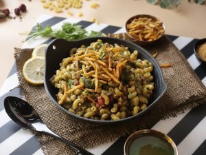 In a bowl,add macaroni,chickpeas,potatoes,onion,tomato,green chilli,cumin seeds,red chilli crushed, chaat masala,prepared green chutney (2 tbs),prepared meethi chutney (2 tbs) & mix well.