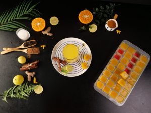 -In a blender jug,add peeled lemon,ginger,turmeric powder,black pepper powder,cinnamon powder, garlic,apple cider vinegar,orange juice,water & blend well.