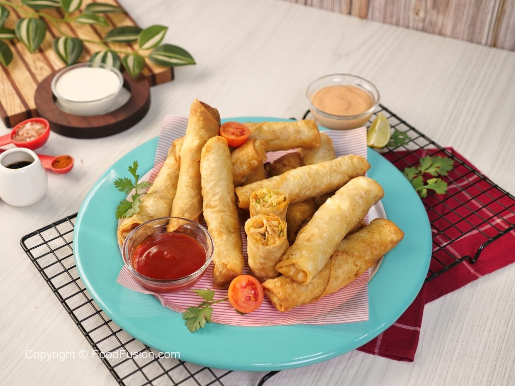 -Cut roll sheets diagonally,making a triangular shape,take one triangle sheet,add prepared filling,apply flour slurry,fold & roll up (makes 18-20).