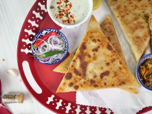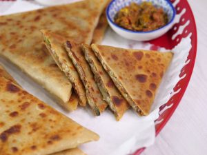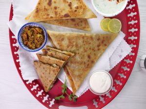 -In a storage box/dish, layer all triangle parathas with plastic sheets in between.