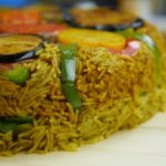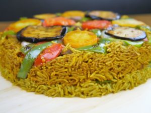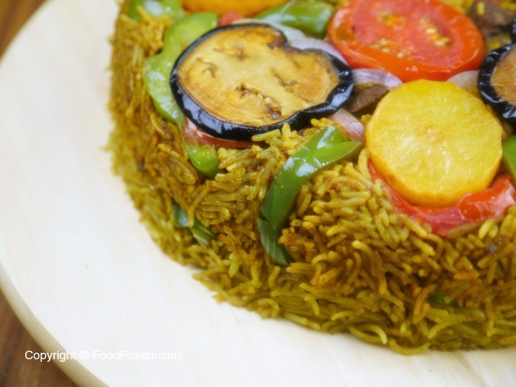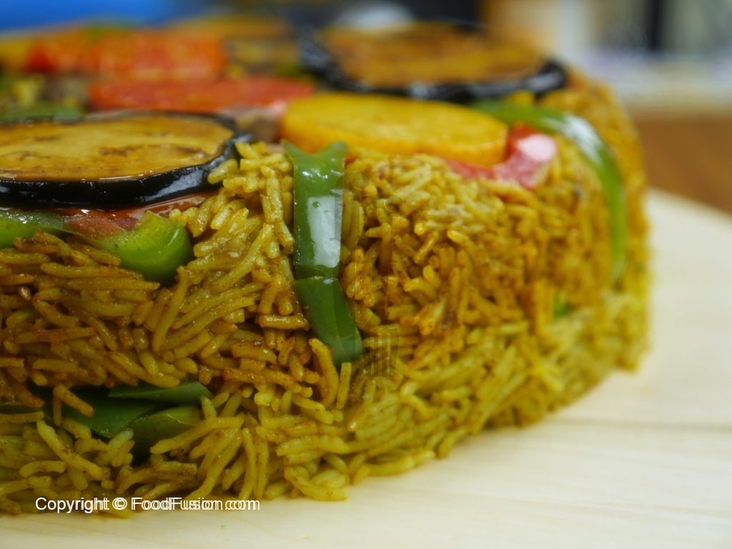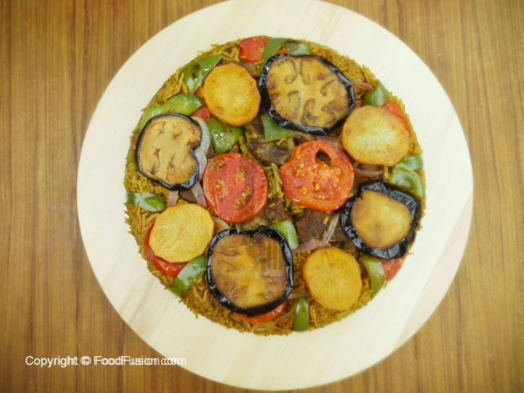 Now add deep fried potato slices,deep fried eggplant slices,fried onion rings,fried capsicum and add a layer of remaining cooked rice and press gently.