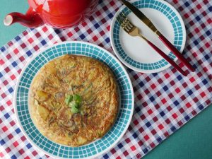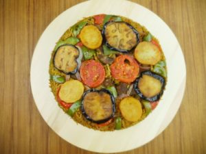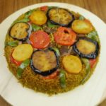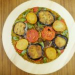 In pot,grease bottom with oil,place deep fried eggplant slices,fried potato slices,fried tomato slices,fried capsicum and fried onion rings.