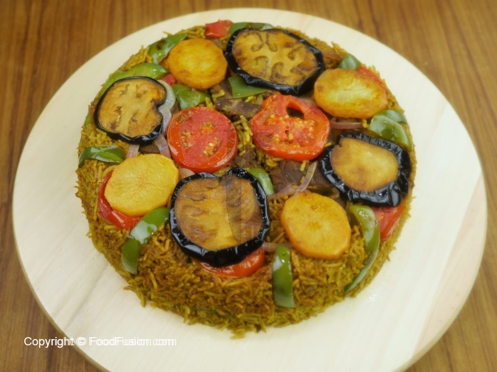 Ab is mein fried aloo slices,deep fried baigan slices,fried pyaz rings,fried shimla mirch dal ker upper sa remaining cooked chawal ki layer laga lein aur halka sa press ker lein.