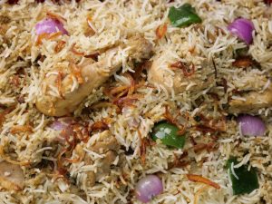 -In remaining gravy,add sauteed vegetables,fried onion,fresh coriander,mint leaves,half quantity of boiled rice,reserved gravy,remaining sauteed vegetables,fried onion,fresh coriander,mint leaves, remaining boiled rice,tarrka desi ghee,fried onion,cover with kitchen cloth and lid & steam cook on low flame for 15-20 minutes.