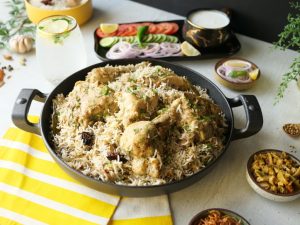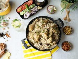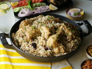 -In remaining gravy,add mint leaves,fresh coriander,fried onion,layer half quantity of boiled rice, reserved gravy,mint leaves,fresh coriander,fried onion,remaining rice,fried onion,steam cooked chicken with gravy,fresh coriander,cover and steam cook on low flame for 15-18 minutes.