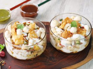 On serving plate,add boiled chickpeas,potato,green chili,prepared manchurian sauce,red chili crushed, chaat masala,papri and sev nimco.