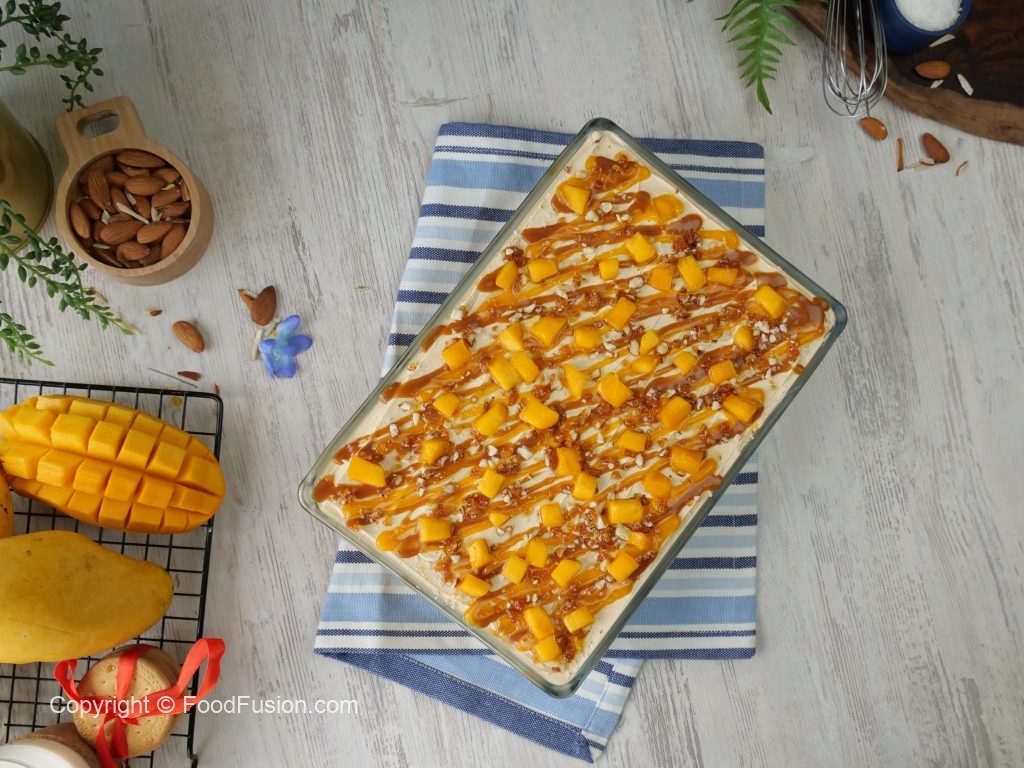 -Mango puree,butterscotch sauce & almond crunch dal dein aur thanda ho janay tak refrigerate ker lein.