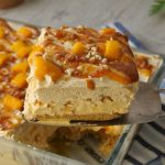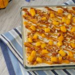 -Drizzle prepared butterscotch sauce,prepared almond crunch,mango chunks,prepared butterscotch whipped cream & spread evenly.