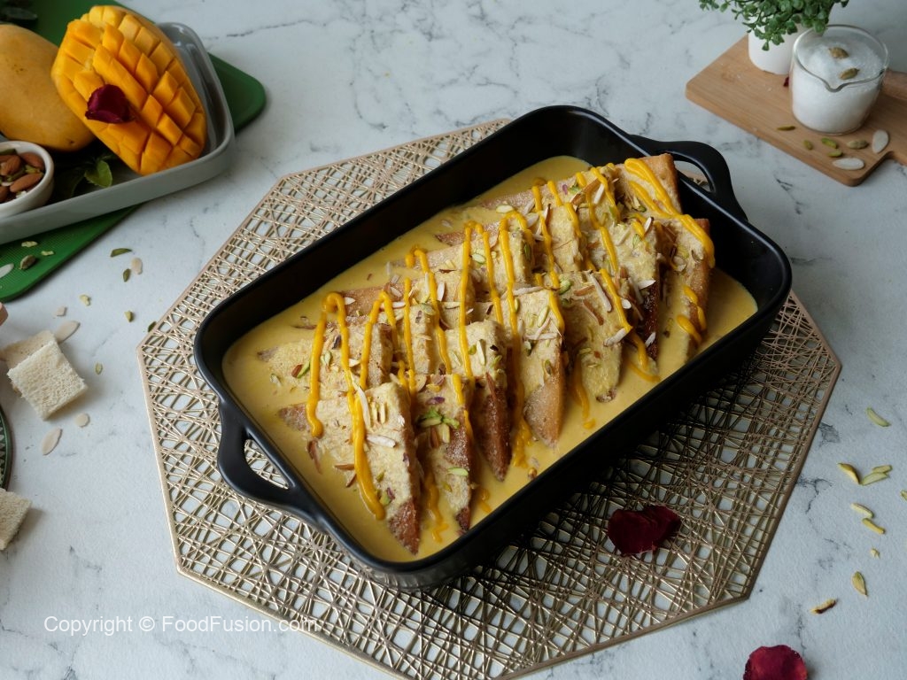 In a serving dish,place bread slices,sprinkle desiccated coconut,pour prepared mango milk syrup,add pistachios,almonds,drizzle prepared mango & cream sauce and serve chilled!