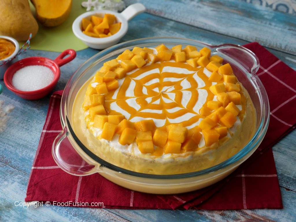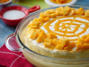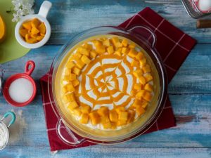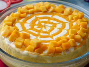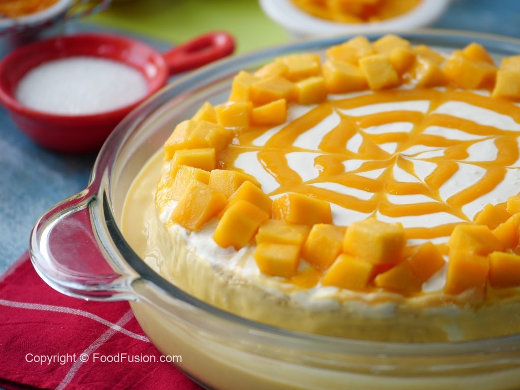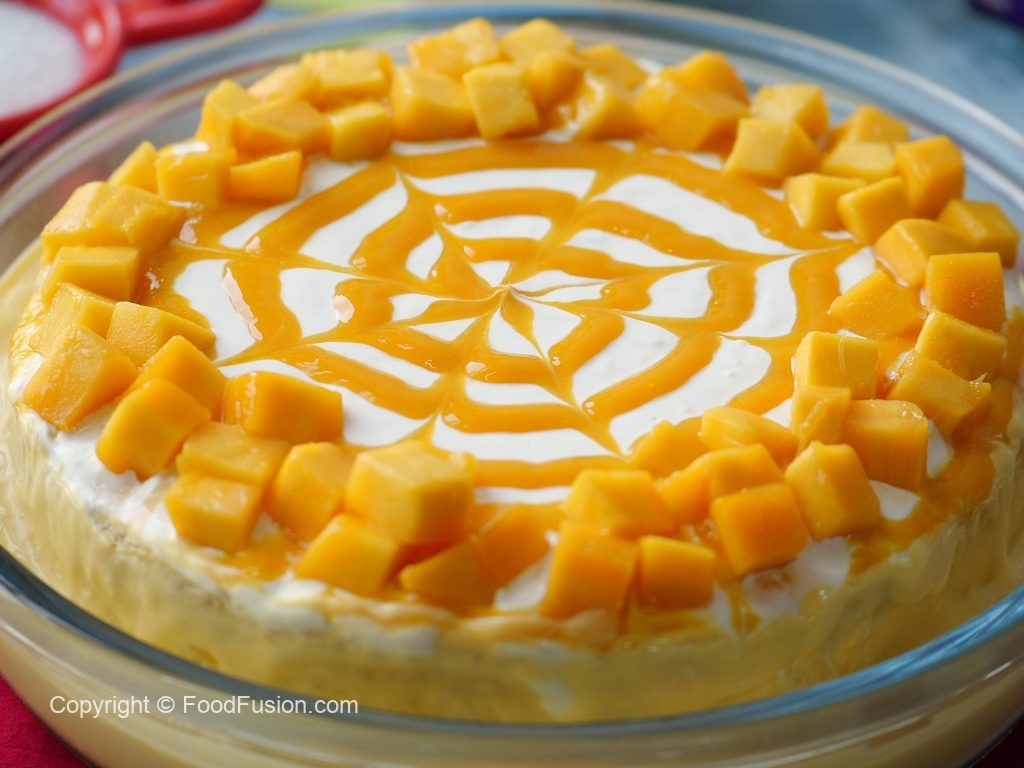 Cream,mango puree aur mango cubes sa garnish ker lein.