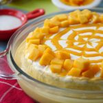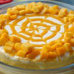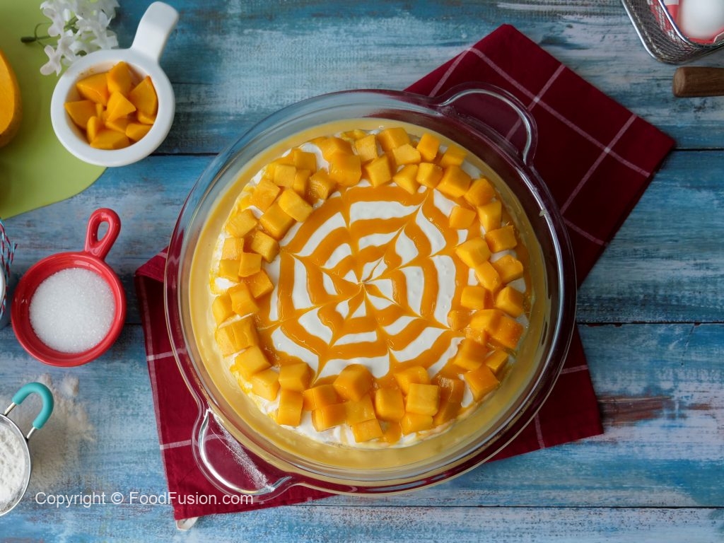 Slowly pour prepared mango milk syrup over the top of the cake,filling holes & refrigerate until chilled (4-5 hours).