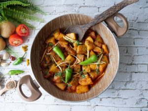-In a serving plate add aloo katli. Garnish with fresh coriander, reserved curry leaves & red chillies.