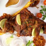 -In pressure cooker,add onions,garlic,marinated mutton leg,fresh coriander,mint leaves,water & garlic bulb,cover & pressure cook on medium flame for 1 hour.