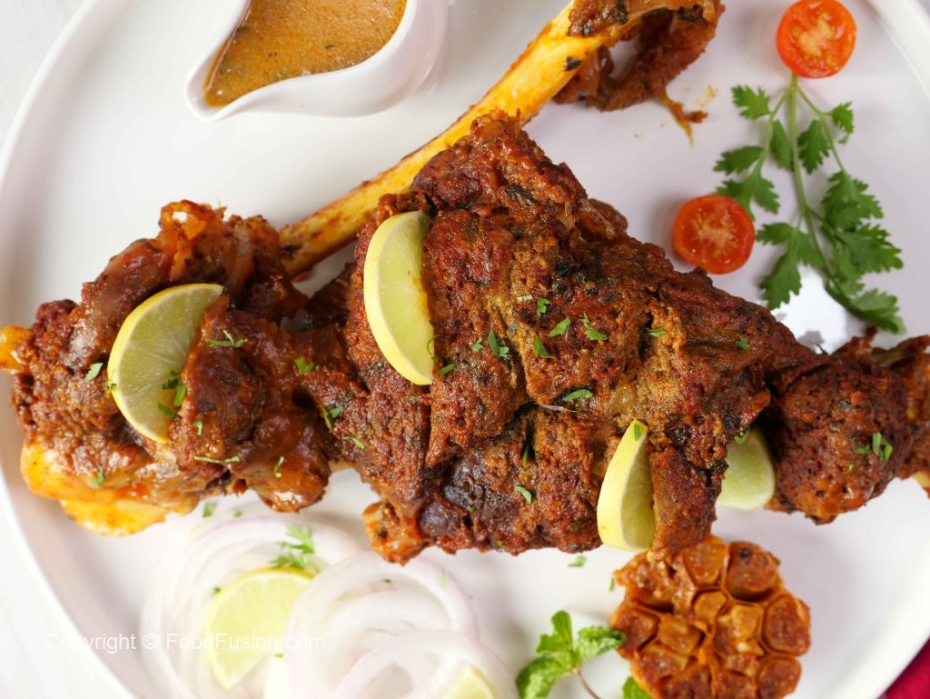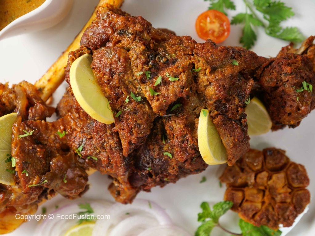 -In a dish,place mutton leg,add raw papaya paste,ginger garlic paste,pink salt,lemon juice & rub well on both sides,cover with cling film & marinate for 30 minutes.