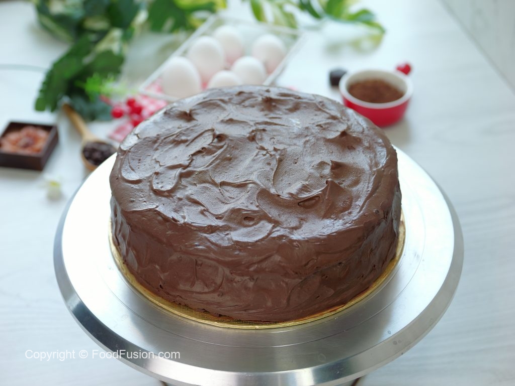 -Cake ki first layer ko cake stand per rakh dein aur tayyar chocolate frosting laga lein.