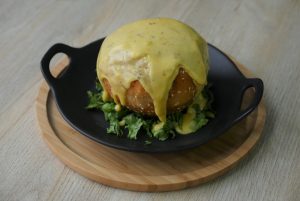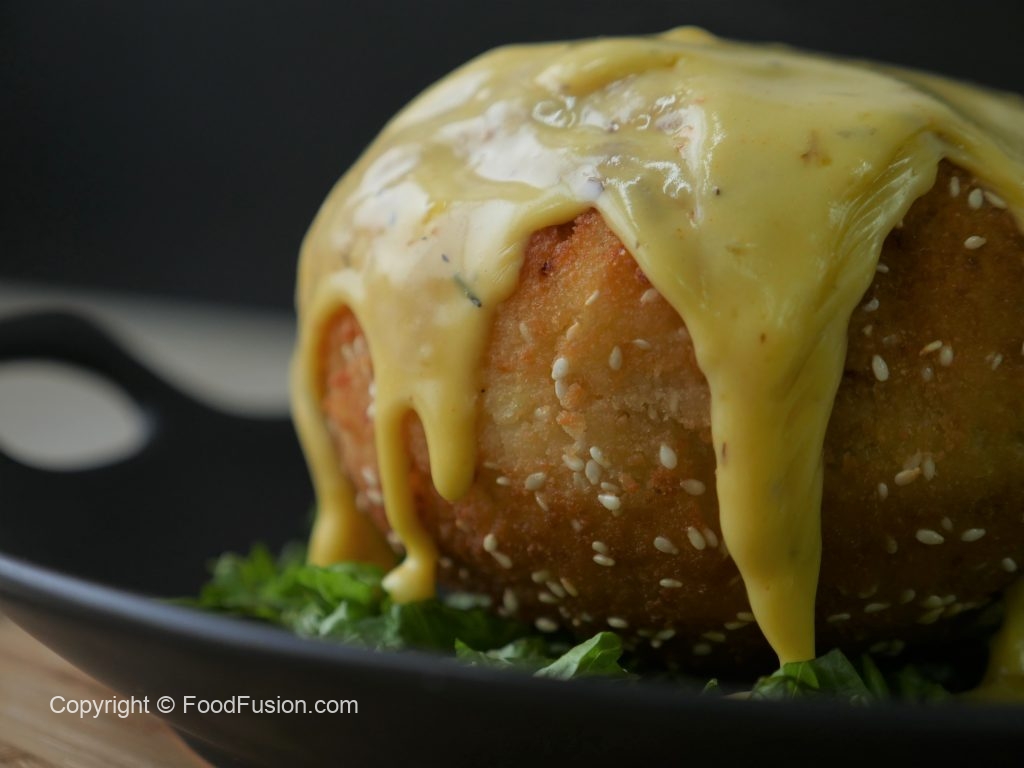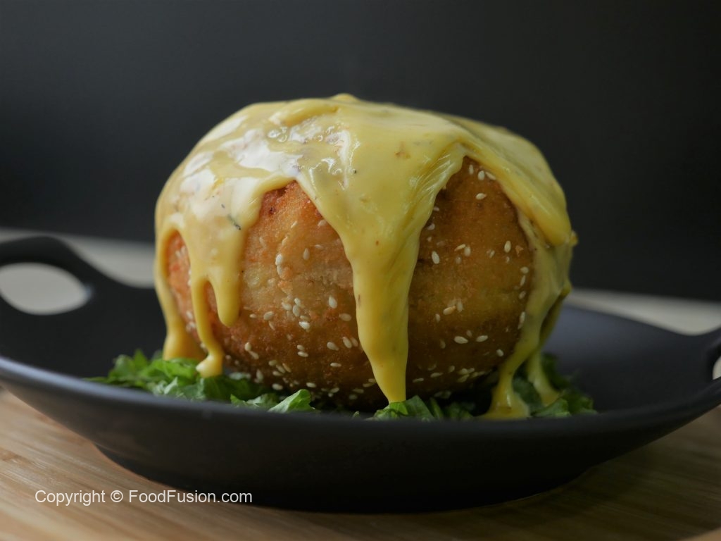 On cling film,add & spread potato mixture,place rice coated ball and coat properly by folding cling film and freeze for 10 minutes.