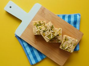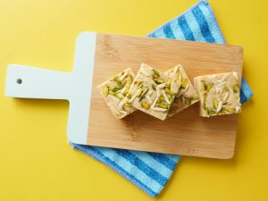 Mould mein cooked khoya/mawa dal ker evenly spread ker lein.