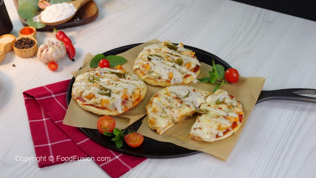 -Chulha bund ker dein,cooked naan per pizza sauce dal ker pheela lein,cooked chicken,tayyar alfredo sauce,cheddar cheese,mozzarella cheese,pickled jalapenos,lal mirch crushed & dried oregano dal ker dhak dein,chulha on karein aur halki ancch per cheese melt ho janay tak paka lein (3-4 minutes).