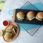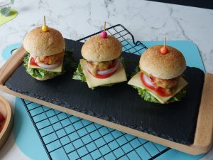 -Cut smini burger buns from center,add & spread prepared burger sauce,lettuce leaf,cheese slice,tomato slice,onion rings,fried chicken nugget,cucumber slices,tomato ketchup,burger sauce and top with another mini bun to make a burger (makes 8-10).