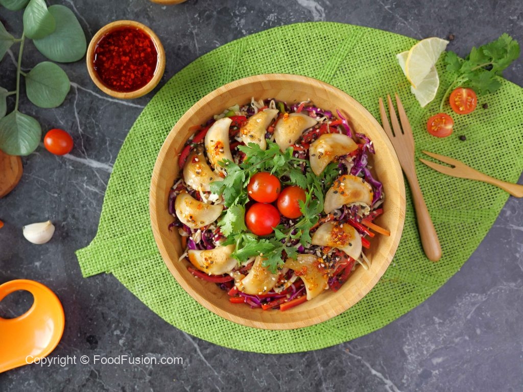 -In a serving bowladd prepared salad,fried dumplings & garnish with fresh coriander,cherry tomatoes, chilli oil,sesame seeds & serve!