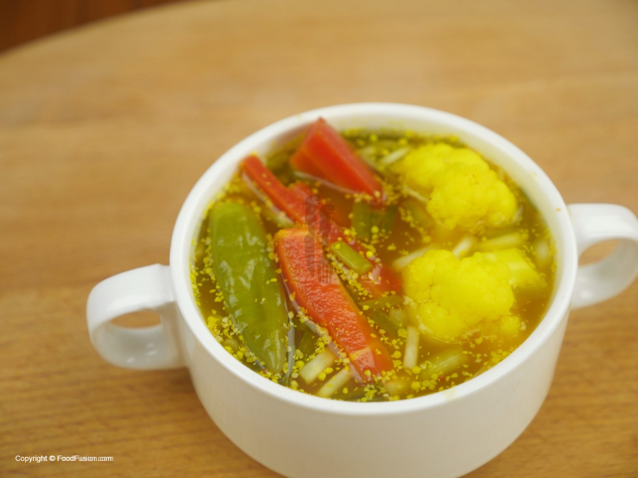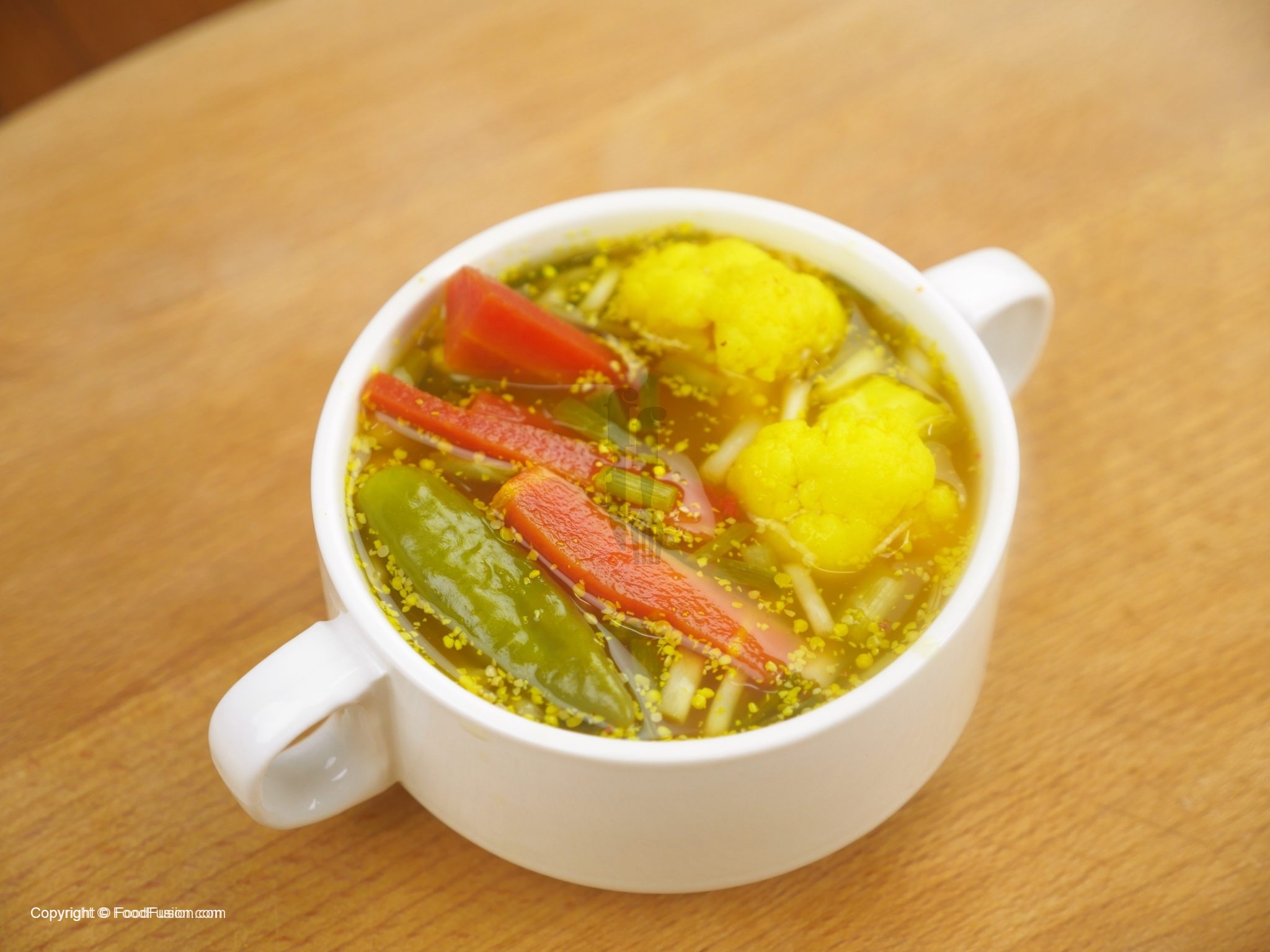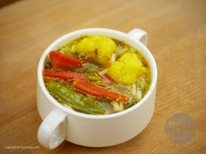 In jar,add carrots,cauliflower,green chilies,green garlic,salt,turmeric powder,mustard seeds crushed,red chili crushed and vinegar and mix well.
