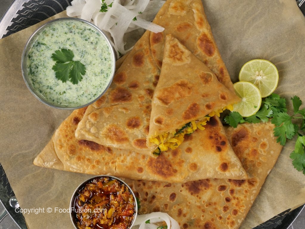 -On a rolled dough,add & spread prepared radish filling,fold one side of the rolled dough,apply water then fold the remaining two sides & make a triangle paratha.