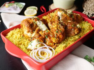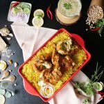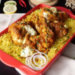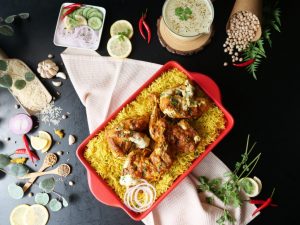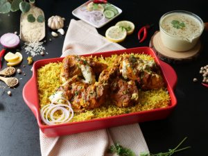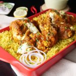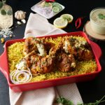 Serve murgh kababi with garlic turmeric rice & chickpea raita!