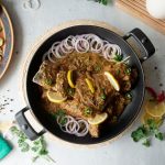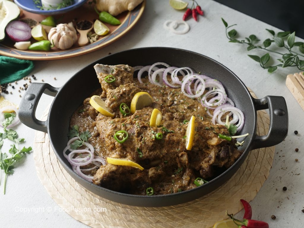 Add fried mutton leg/dasti & pour gravy,cover & cook on low flame until tender (1 & ½ hour ),rotate & flip in between.