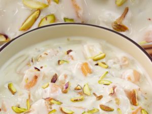 -Reserved whipped cream,mango slices,fresh flowers,podina & red raspberry sa decorate ker ka serve karein!