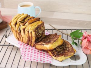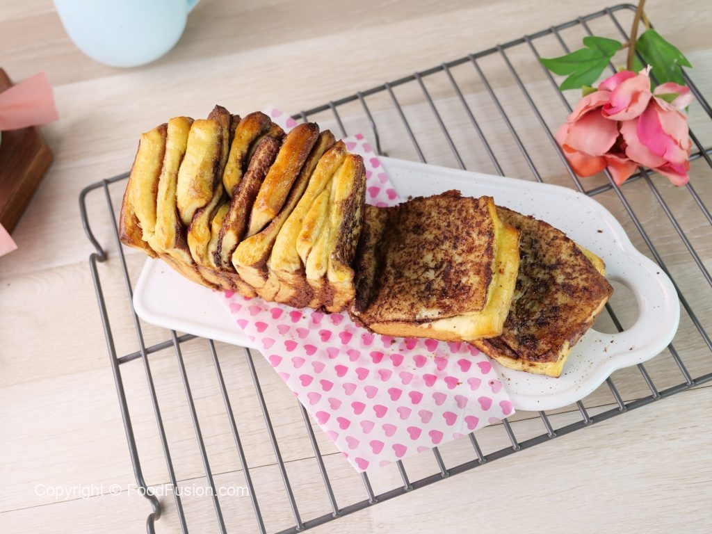 -3”x7”inch pan (greased with butter) mein bread pieces rakh dein aur few times tap karein aur brush ki madad sa anda laga lein.