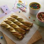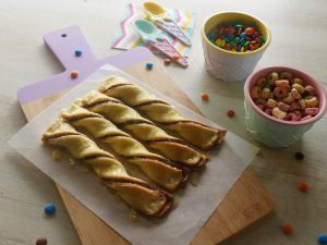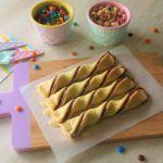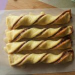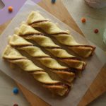 Add nutella spread & spread evenly and sandwich the sheets together and cut into equally 1x17” size strips.